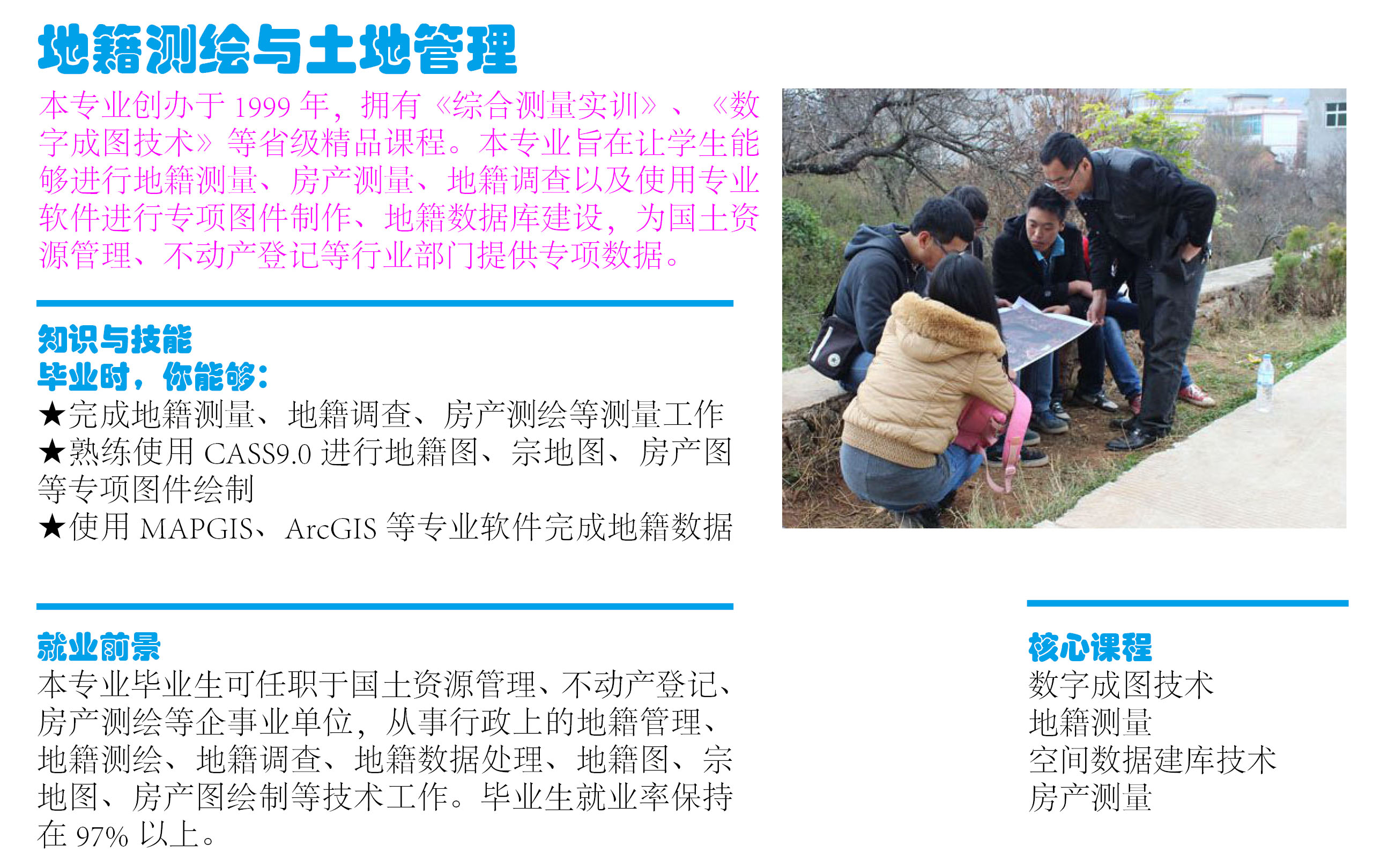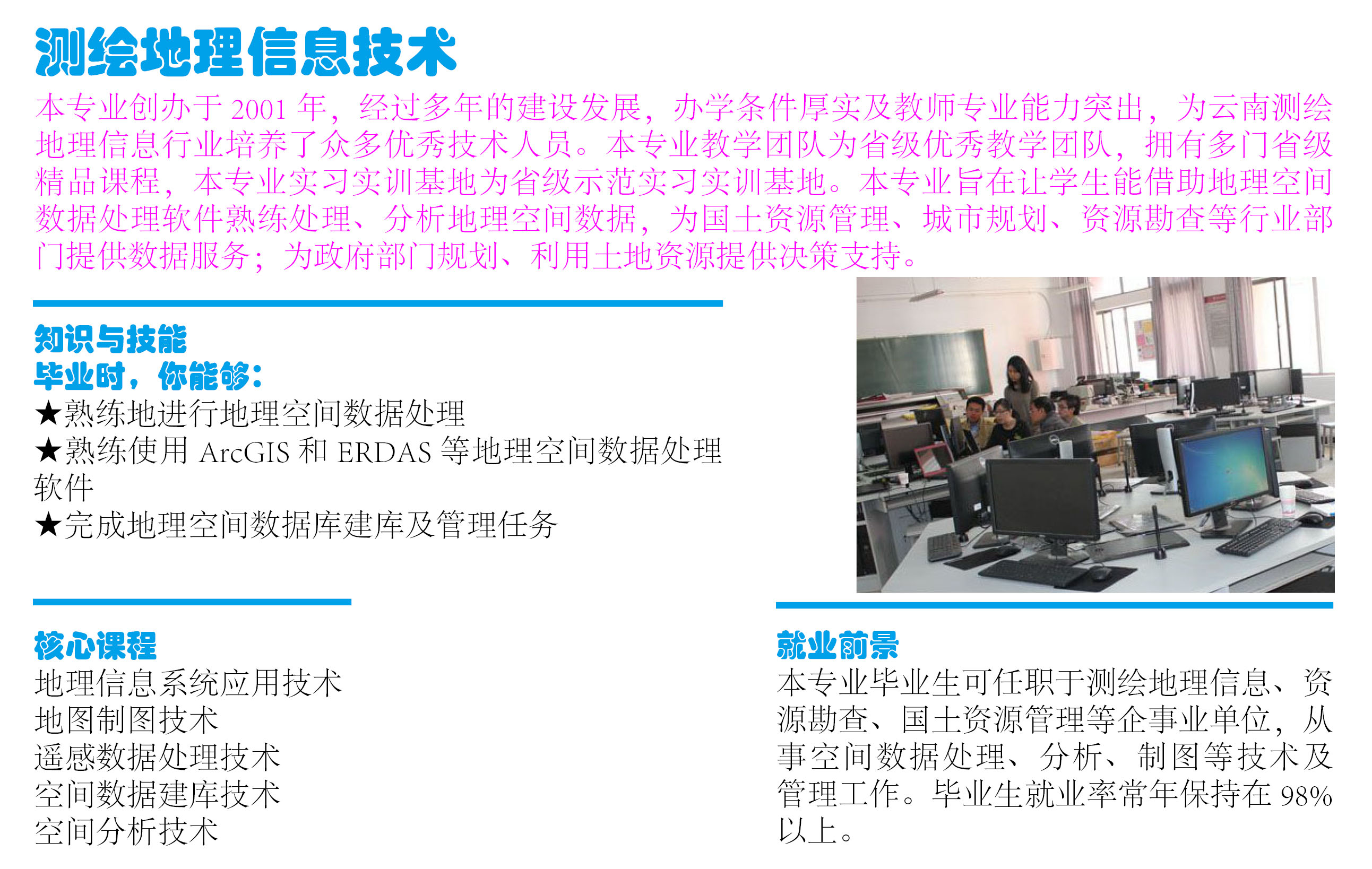 測(cè)繪地理信息學(xué)院依據(jù)測(cè)繪地理信息產(chǎn)業(yè)發(fā)展對(duì)技術(shù)人才的需求,立足云南、面向西部地區(qū)設(shè)置相應(yīng)專業(yè),目前開設(shè)"地理信息系統(tǒng)與地圖制圖技術(shù)"、"測(cè)繪工程技術(shù)"、"地籍測(cè)繪與土地管理信息技術(shù)"、"工程測(cè)量與監(jiān)理"四個(gè)專業(yè);專業(yè)設(shè)置得到省教育主管部門、行業(yè)企業(yè)、學(xué)生及家長(zhǎng)的高度認(rèn)可。2011年度,系在校生人數(shù)達(dá)到1360人,是學(xué)院12個(gè)院系中學(xué)生人數(shù)最多的系,同時(shí)也是云南省高等學(xué)校中測(cè)繪地理信息類專業(yè)學(xué)生人數(shù)最多的院系。