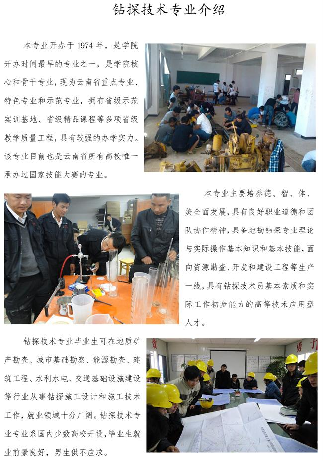 應(yīng)用工程學(xué)院現(xiàn)設(shè)置有鉆探技術(shù)、基礎(chǔ)工程技術(shù)、安全技術(shù)管理、環(huán)境監(jiān)測與治理技術(shù)、金屬礦開采技術(shù)等5個專業(yè),長期致力為云南省區(qū)域經(jīng)濟發(fā)展培養(yǎng)急缺的高等技術(shù)應(yīng)用型人才。在十幾年的發(fā)展過程中,應(yīng)用工程學(xué)院始終遵循“以能力為導(dǎo)向”的高等職業(yè)教育辦學(xué)要求,立足產(chǎn)業(yè)行業(yè)發(fā)展,面向生產(chǎn)實際需要,強化校企合作,深化專業(yè)教育教學(xué)改革,開設(shè)的專業(yè)均構(gòu)建了以工作過程系統(tǒng)化的課程體系,形成了工學(xué)結(jié)合的人才培養(yǎng)模式,專業(yè)教育教學(xué)改革成果成果豐碩,人才培養(yǎng)質(zhì)量提到不斷提升。其中,鉆探技術(shù)專業(yè)現(xiàn)為云南省重點專業(yè)、特色專業(yè)和省級示范專業(yè),建有校內(nèi)、校外省級示范實習(xí)實訓(xùn)基地各1個,省級精品課程1門,校級精品課程5門,辦學(xué)實力為國內(nèi)相同專業(yè)最強。依托于該專業(yè),學(xué)校多次承辦云南省鉆探技能大賽,2011年11月還成功承辦了第一屆全國地勘鉆探職業(yè)技能大賽,獲得國家相關(guān)部委的表彰。2014年,安全技術(shù)管理專業(yè)成功申報“云南省高職院校提升專業(yè)服務(wù)產(chǎn)業(yè)能力建設(shè)項目”,獲得省財政廳和教育廳150萬元的建設(shè)資金。同時,依托云南省世行貸款高職院校建設(shè)項目,基礎(chǔ)工程技術(shù)、環(huán)境監(jiān)測與治理技術(shù)和金屬礦開采技術(shù)等專業(yè)在專業(yè)建設(shè)和實訓(xùn)條件建設(shè)上得到大額資金的支持,專業(yè)辦學(xué)實力都將得到較大提升。