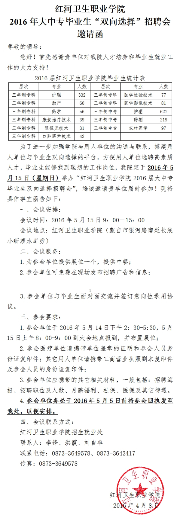 紅河衛(wèi)生職業(yè)學院2016年“雙向選擇”招聘會邀請函