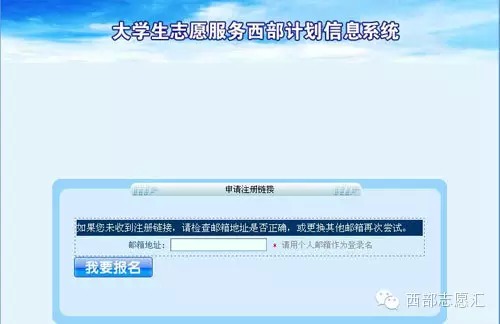 3.申請注冊鏈接。點擊右側(cè)下方的“志愿者報名”進入申請注冊鏈接頁面(http://west.youth.cn/password_save/login.jsp),填寫郵箱地址完成申請注冊鏈接。