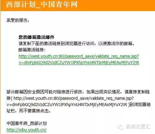 4.登錄注冊郵箱。填寫完個人郵箱后,點擊“我要報名”后,頁面會彈出對話框提示(http://west.youth.cn/password_save/send_username4emial.jsp):您的注冊鏈接已經(jīng)發(fā)到您的郵箱里,請登錄您的郵箱完成注冊!