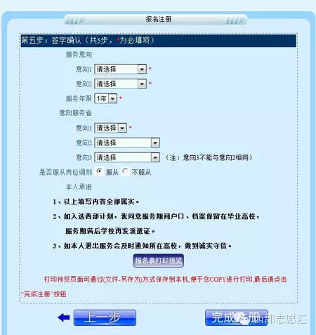 10.簽字確認。(http://west.youth.cn/zyz/user_reg4save.jsp?step=5)。注意帶紅星項為必填項。填寫完后,點擊報名表打印預(yù)覽按鈕,如果查看無誤后,可通過(文件-另存為)方式保存到本機,便于您COPY進行打印,最后點擊完成注冊。注冊完成后把打印出來的報名表交到學校(學院)團委審核、簽字、蓋章。報名工作到此結(jié)束,等待學校通知。(見圖十)