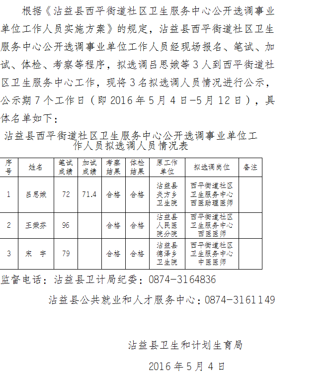 沾益縣西平街道社區(qū)衛(wèi)生服務(wù)中心2016年選調(diào)事業(yè)單位擬選公示