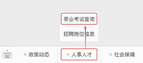 1 )點擊公眾號底部的【人事人才】菜單,再點擊【事業(yè)考試查詢】,如下圖所示