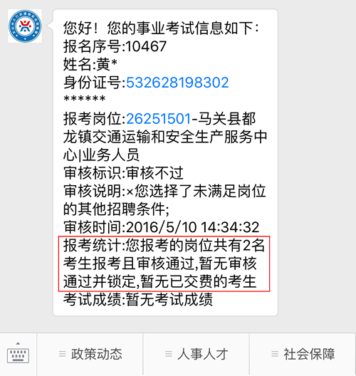 2 )微信公眾號會顯示您所報崗位的報考情況,如下圖所示