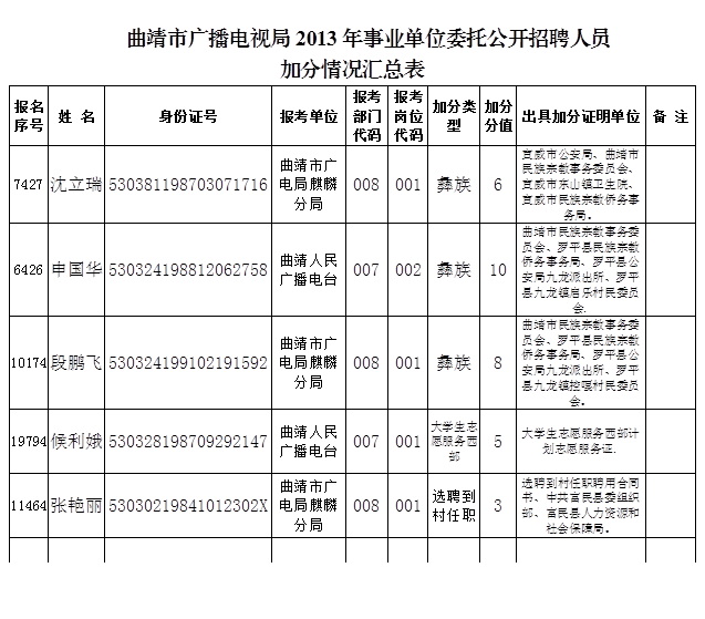 根據(jù)《曲靖市人民政府關于做好2013年普通高等學校畢業(yè)生就業(yè)工作的意見》(曲政發(fā)〔2013〕52號)、《曲靖市事業(yè)單位公開招聘人員試行辦法》(曲人社〔2011〕55號)等文件規(guī)定,經(jīng)曲靖市廣播電視局審核,曲靖市人力資源和社會保障局復審,現(xiàn)就符合加分條件的人員予以公示。