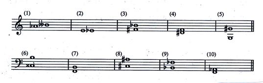 36.將下列音程轉(zhuǎn)位,并標(biāo)出原有音程和轉(zhuǎn)位后音程的名稱(chēng)。