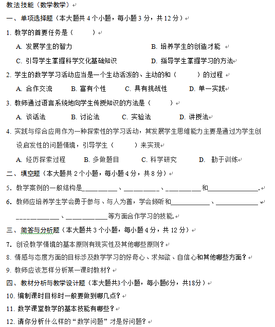考試形式:閉卷,筆試。“專業(yè)知識”滿分100分,考試用時100分鐘;“教法技能”滿分50分,考試用時50分鐘。二者合卷滿分共150分,考試限定用時150分鐘。