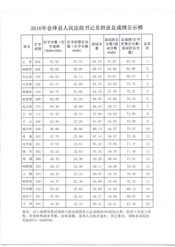 會澤縣人民法院2016年招聘書記員成績公示