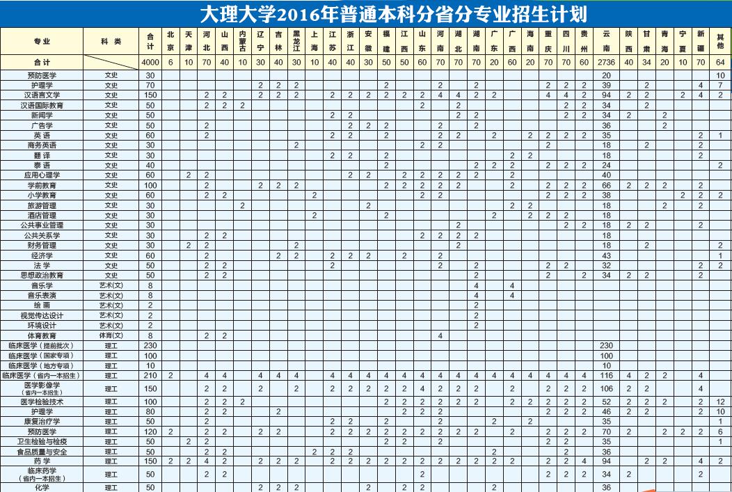 大理大學(xué)2016年普通本科分省專業(yè)招生計(jì)劃