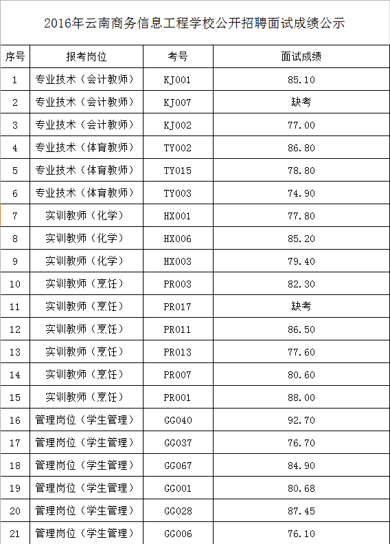 2016年云南商務(wù)信息工程學(xué)校公開招聘面試成績(jī)公示