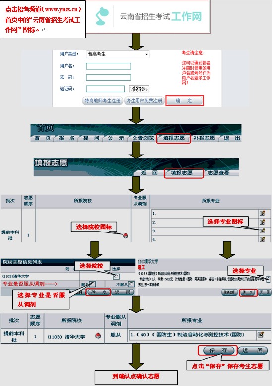 在填報(bào)截止時(shí)間之前,考生登錄工作網(wǎng)(http://www.ynzs.cn或http://www.ynzk.cn),自行進(jìn)行志愿填報(bào);在確認(rèn)截止時(shí)間之前,考生攜帶第二代身份證和準(zhǔn)考證到確認(rèn)點(diǎn)進(jìn)行確認(rèn)、簽字,完成志愿填報(bào)。