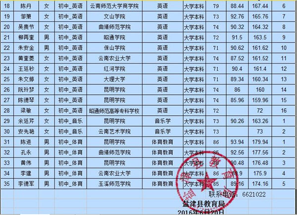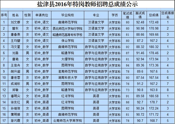 昭通市鹽津縣2016年特崗教師招聘總成績(jī)公示