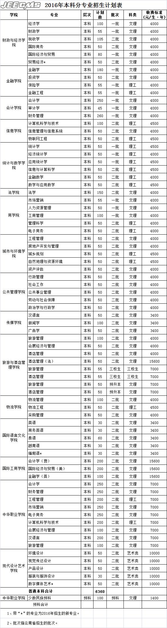 云南財(cái)經(jīng)大學(xué)2016年普高分類別專業(yè)招生計(jì)劃表