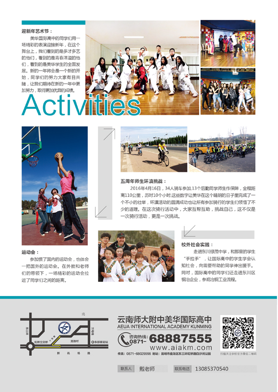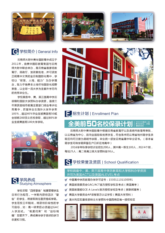 云南師大附中美華國際高中成立于2011年,由云南師大附中與美國教育協(xié)會機(jī)構(gòu)聯(lián)合舉辦,是云南省首家經(jīng)教育廳、民政廳、發(fā)改委正式批準(zhǔn)的寄宿制國際化高中。學(xué)校秉承“智慧、人格、能力”的辦學(xué)理念,致力于培養(yǎng)具有本土情懷和國際化視野,并以全球一流大學(xué)為主要升學(xué)方向的優(yōu)秀畢業(yè)生。辦學(xué)5年來,美華國際高中已畢業(yè)100余人,全部畢業(yè)生順利升入海外知名大學(xué)就讀,其中90%的畢業(yè)生升學(xué)方向為美國,80%的學(xué)生被全美前100大學(xué)錄取,25%的畢業(yè)生被全美前50或全球前200大學(xué)錄取。