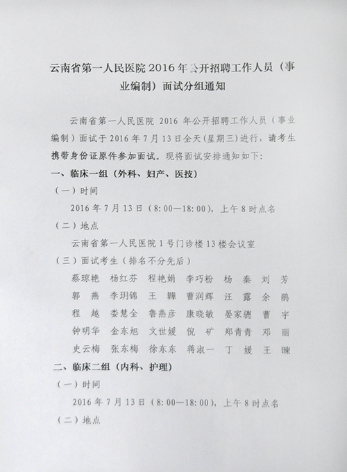 云南省第一人民醫(yī)院2016年公開招聘 工作人員(事業(yè)編制)面試分組通知