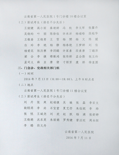 云南省第一人民醫(yī)院2016年招聘(事業(yè)編)面試分組通知