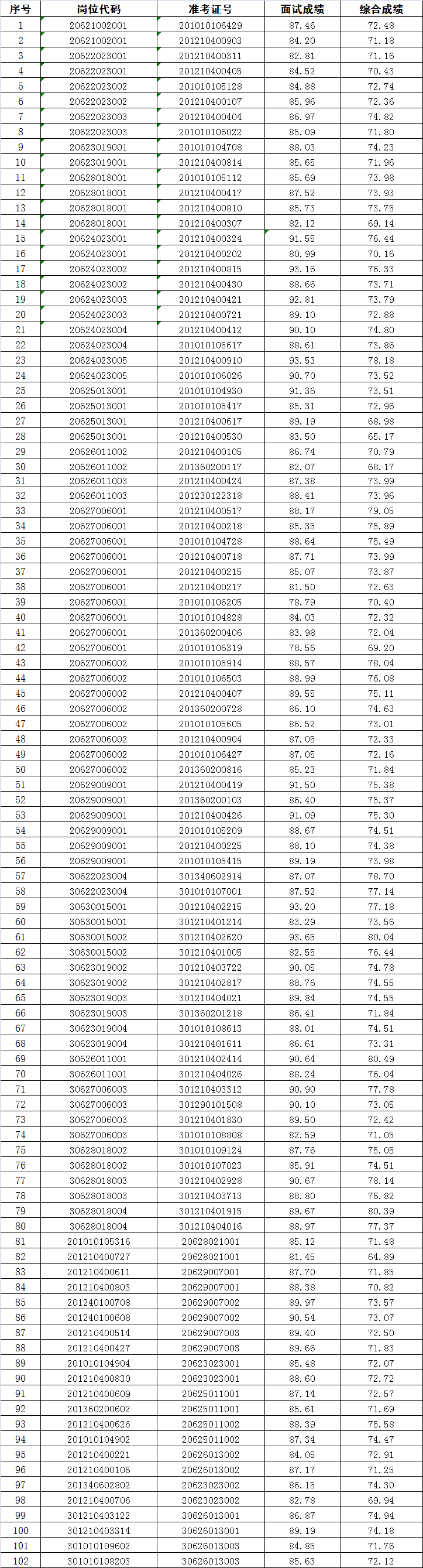 根據(jù)《2016年昭通市法檢系統(tǒng)考試錄用公務(wù)員面試及后續(xù)工作安排的公告》,我市法檢系統(tǒng)考生于7月15日進行了面試。法院系統(tǒng)考生參加面試人員80人,檢察院系統(tǒng)考生參加面試人員22人。現(xiàn)將考生面試成績及綜合成績公布如下: