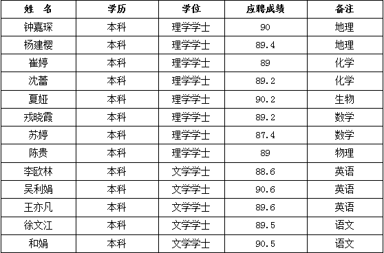 為滿足2016年學(xué)校教育教學(xué)工作的需要,提高教師隊(duì)伍的素質(zhì),優(yōu)化教師隊(duì)伍的結(jié)構(gòu),將“高學(xué)歷、高素質(zhì)、專業(yè)化”的優(yōu)秀人才充實(shí)到我校。根據(jù)相關(guān)規(guī)定和要求,鐘嘉琛等13名高等院校畢業(yè)生通過對(duì)教育教學(xué)工作的認(rèn)識(shí)、語(yǔ)言表達(dá)能力、應(yīng)變能力、專業(yè)知識(shí)問答等綜合能力的考核,體檢合格,相關(guān)證件齊全,擬聘用鐘嘉琛等13名同志為事業(yè)單位工作人員,現(xiàn)予以公示,公示期為7天(2016年7月25日至8月1日)。