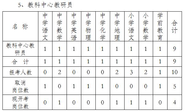 按照《巧家縣2016年縣城規(guī)劃區(qū)內(nèi)學校教師和教科中心教研員公開選調(diào)公告》中“縣城規(guī)劃區(qū)內(nèi)學校教師選調(diào)辦法”中“各選調(diào)崗位按照報名不低于1:3的比例進行筆試,報名低于1:3比例的選調(diào)崗位,削減選調(diào)名額或取消該崗位的選調(diào)。”和“教科中心教研員選調(diào)辦法”中“各選調(diào)崗位按照報名不低于1:2的比例進行筆試,達不到1:2比例的取消該選調(diào)崗位。”的規(guī)定,根據(jù)各選調(diào)崗位報名情況,經(jīng)審查,2016年縣城規(guī)劃區(qū)內(nèi)學校教師和教科中心教研員公開選調(diào)崗位設置作如下調(diào)整: