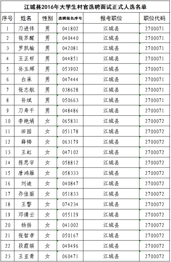附件:《江城縣2016年大學生村官選聘面試正式人選名單》