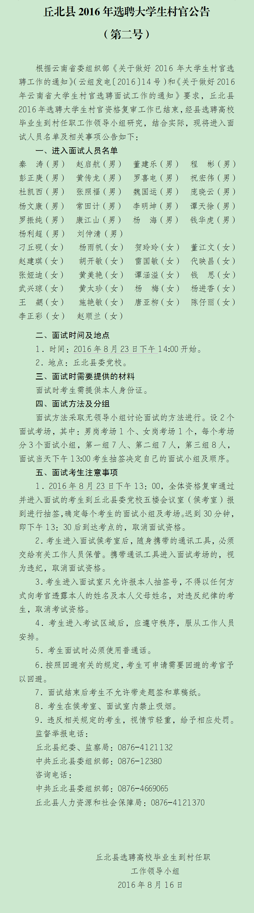文山州丘北縣2016年村官選聘面試公告