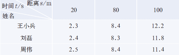 (1)學(xué)校運動會男子100m賽,同學(xué)們測量了前三名運動員到達距起點20m、80m和100m處的時間,數(shù)據(jù)見下表。