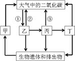 C.圖中乙、丙、丁三者組成的食物鏈?zhǔn)牵阂?rarr;丙→丁