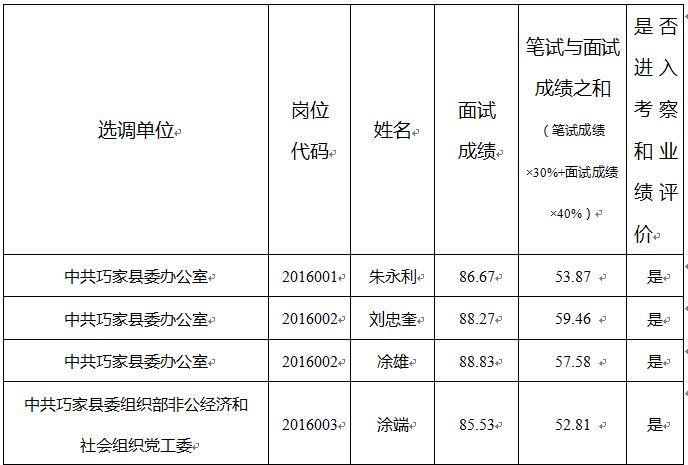 巧家縣縣直機(jī)關(guān)事業(yè)單位2016年下半年公開選調(diào)工作人員面試工作已經(jīng)結(jié)束?,F(xiàn)將面試成績及進(jìn)入考察和業(yè)績評價(jià)人選公告如下: