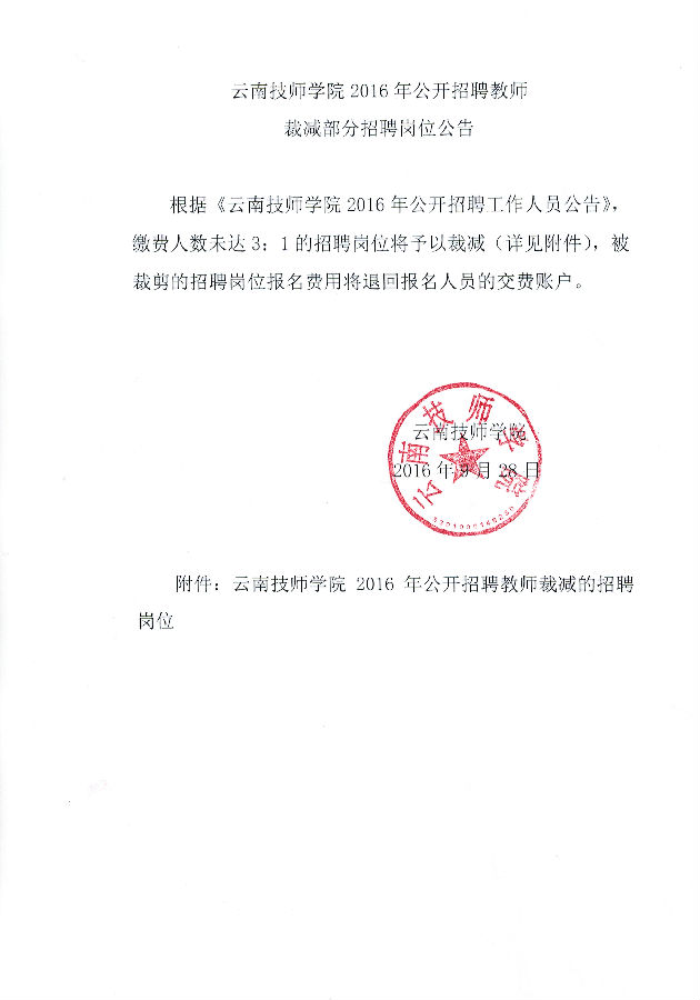 云南技師學(xué)院2016年招聘教師裁減部分招聘崗位公告