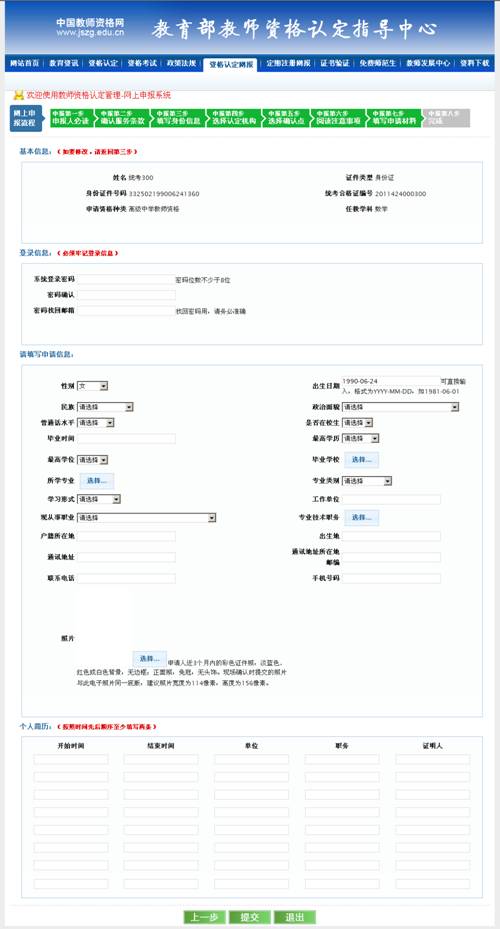該頁面中,第一個方框內(nèi)的信息是根據(jù)申請人參加“中小學(xué)和幼兒園教師資格考試”時的報考信息提取的,不能修改。