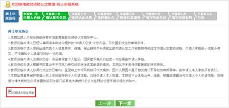 申請人閱讀“網(wǎng)上申報協(xié)議”完畢,選中“已閱讀并完全同意”前的復(fù)選框,才可點擊“下一步”按鈕,進入申報第三步。否則,系統(tǒng)將給出提示。