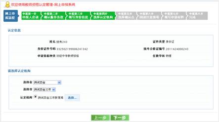第二個方框用來選擇認定機構(gòu)。請首先選擇認定的省和市,然后點擊“認定機構(gòu)”旁邊的“選擇”按鈕,系統(tǒng)會顯示出所選省市下所有能認定您所申報教師資格種類的認定機構(gòu)。選擇好認定機構(gòu)(即教育局)后,點擊“下一步”按鈕,進入申報第五步。