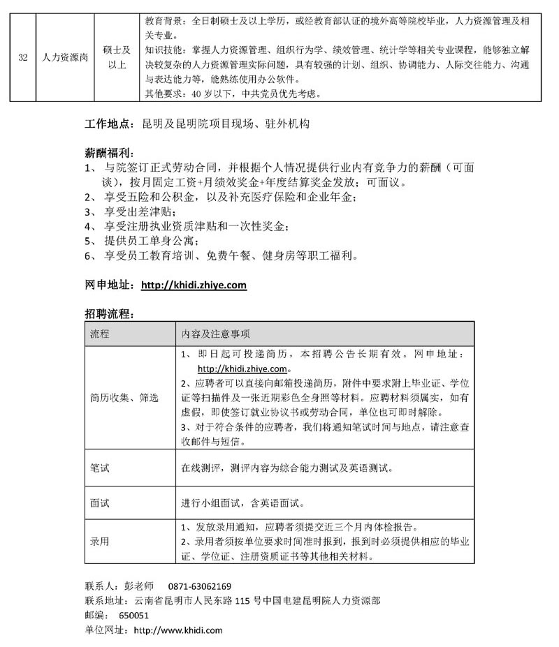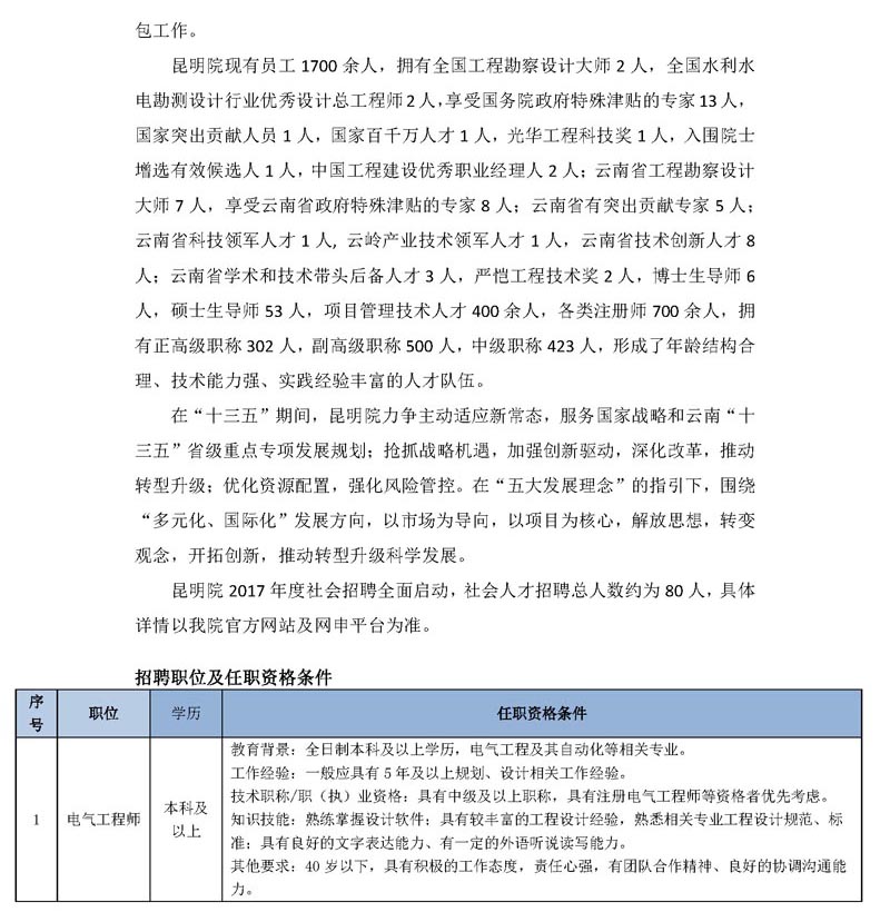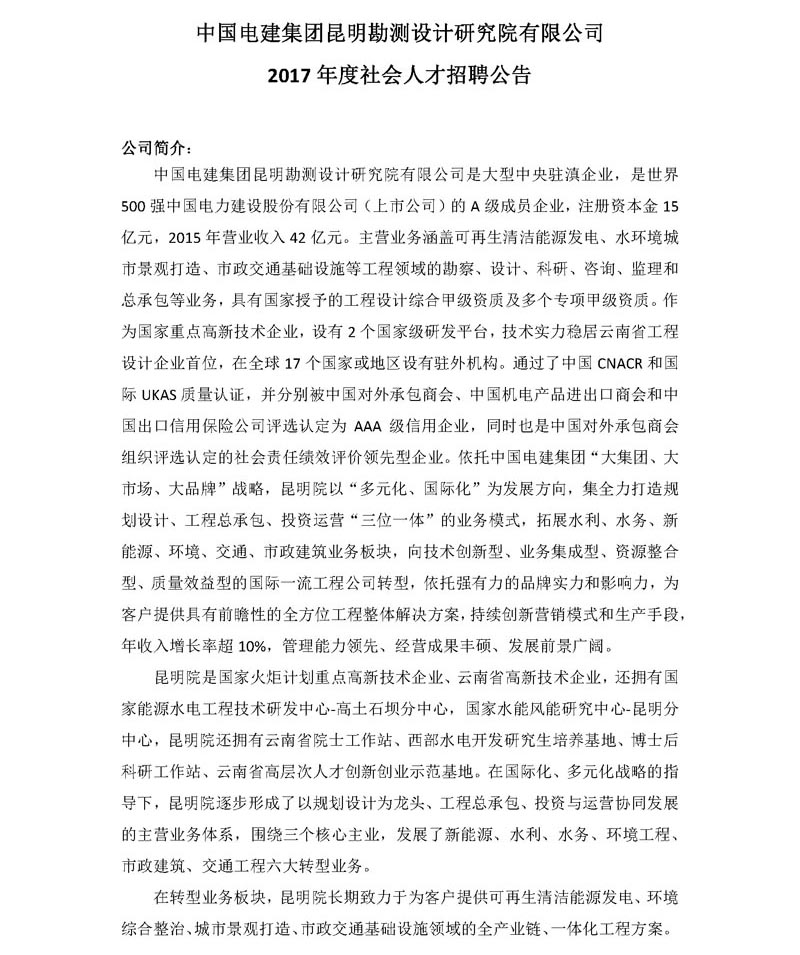 中國電建集團(tuán)昆明勘測(cè)設(shè)計(jì)研究院有限公司2017年社會(huì)招聘公告