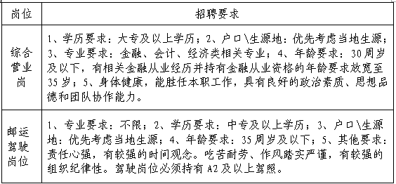綜合營業(yè)崗1、學(xué)歷要求:大專及以上學(xué)歷;2、戶口\生源地:優(yōu)先考慮當(dāng)?shù)厣矗?、專業(yè)要求:金融、會計、經(jīng)濟類相關(guān)專業(yè);4、年齡要求:30周歲及以下,有相關(guān)金融從業(yè)經(jīng)歷并持有金融從業(yè)資格的年齡要求放寬至35歲;5、身體健康,能勝任本職工作,具有良好的政治素質(zhì)、思想品德和團隊協(xié)作能力。