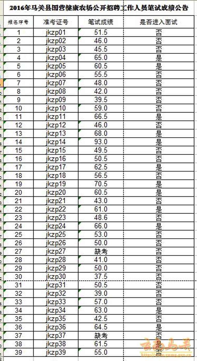 2016年馬關縣國營健康農場公開招聘工作人員筆試成績公告