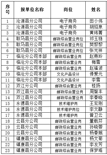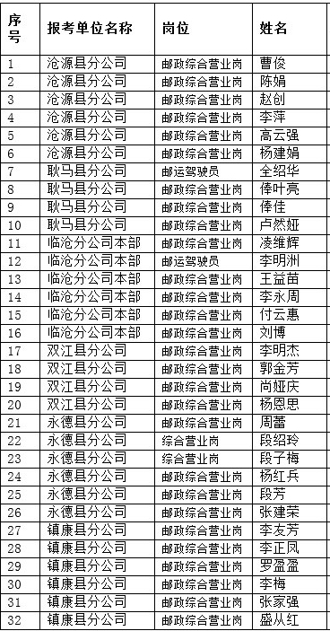 中國(guó)郵政集團(tuán)公司臨滄市分公司招聘勞務(wù)工和大學(xué)生見習(xí)崗報(bào)名已經(jīng)結(jié)束,經(jīng)過資格審查,現(xiàn)將進(jìn)入招聘面試環(huán)節(jié)的相關(guān)人員及考核相關(guān)事宜公示如下:
