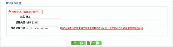 2、出現(xiàn)“您在本年度內(nèi)已經(jīng)申請了×××教師資格,同一自然年內(nèi)不允許申請兩種教師資格”的提示怎么辦?