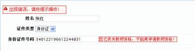 4、出現(xiàn)“您已喪失教師資格,不能再申請教師資格”或“您因×××被限制申請教師資格,限制結(jié)束時間為×××”的提示怎么辦?