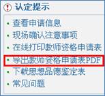從哪里下載“教師資格認定申請表”? 申請人登錄網(wǎng)上報名系統(tǒng)后,在頁面右上方“認定提示”欄中有“導(dǎo)出教師資格申請表PDF”鏈接,點擊該鏈接,根據(jù)申請表打印紙張大小要求,選擇導(dǎo)出格式,點擊“導(dǎo)出”按鈕,教師資格認定申請表則以PDF的格式呈現(xiàn),點擊PDF閱讀器里的保存按鈕,教師資格申請表則以PDF格式保存到本地機上。(您的計算機里必須安裝PDF閱讀器才能打開下載的PDF格式申請表)