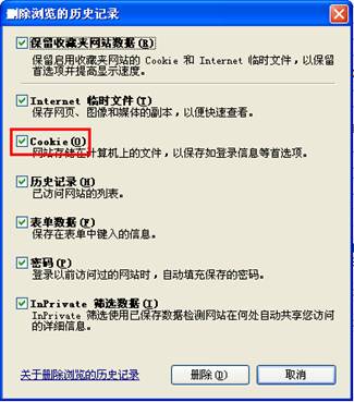 如何清除IE瀏覽器的緩存? 點(diǎn)擊IE瀏覽器的“工具”菜單 選擇“刪除瀏覽的歷史記錄”命令,在彈出的對(duì)話框中選中Cookie”復(fù)選框,再點(diǎn)擊對(duì)話框底端的“刪除”按鈕即可。