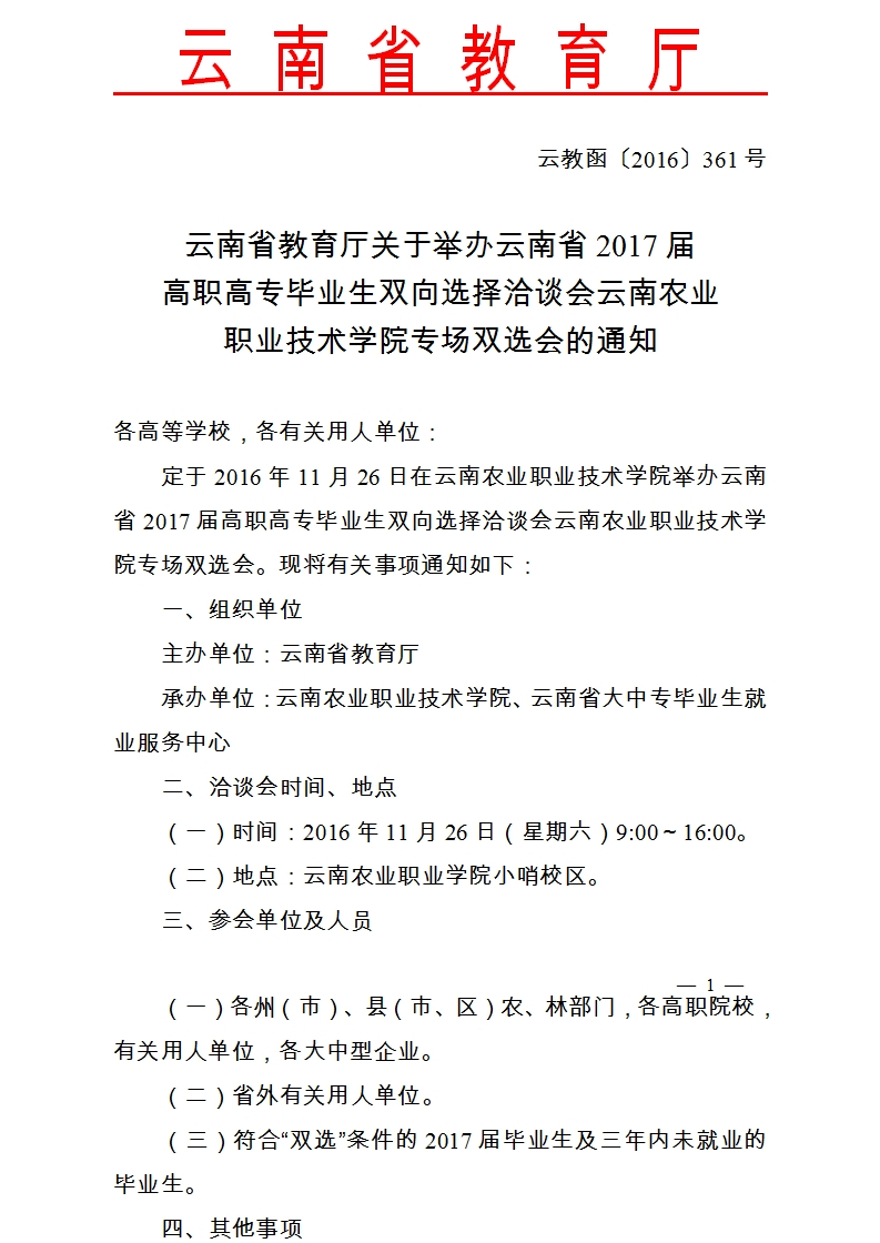 云南農(nóng)業(yè)職業(yè)技術(shù)學(xué)院2017年專(zhuān)場(chǎng)雙選會(huì)的通知