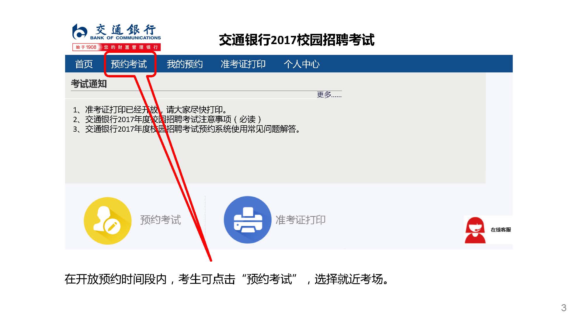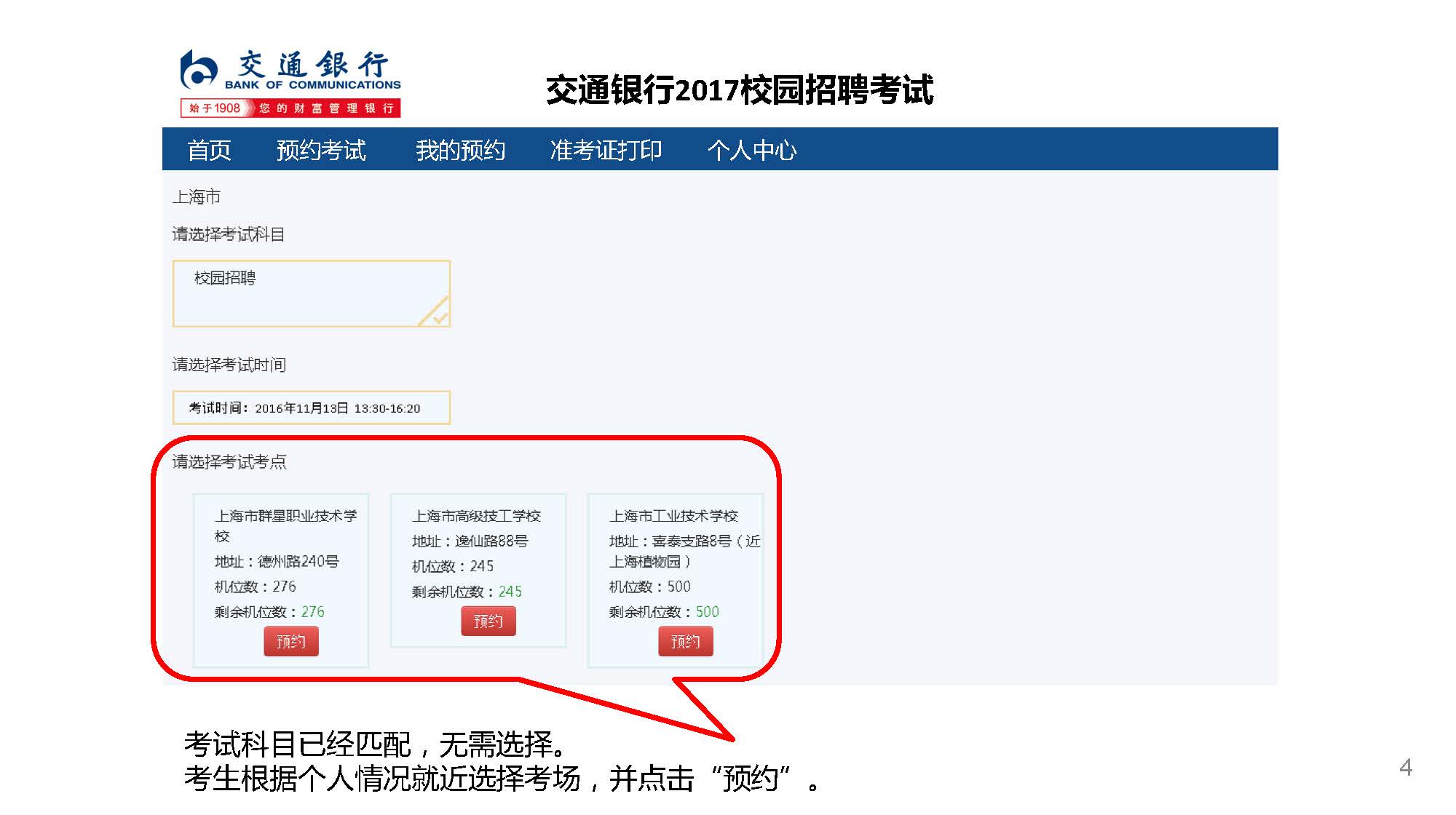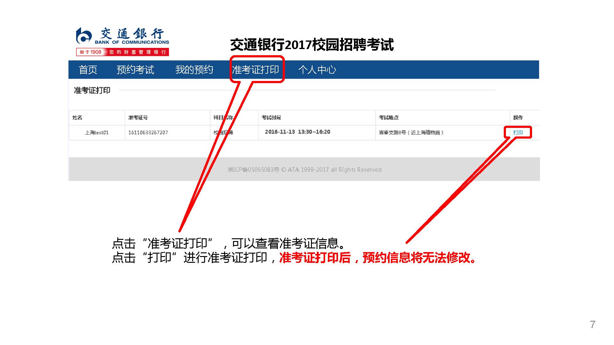 如逾期未預(yù)約,系統(tǒng)將根據(jù)考生申請(qǐng)的參考城市自動(dòng)分配考場(chǎng) 準(zhǔn)考證打印時(shí)間:2016年11月8日10:00-2016年11月12日24:00 考場(chǎng)預(yù)約及準(zhǔn)考證打印地址:bankcomm.campustest.cn 客服熱線:021-61948899