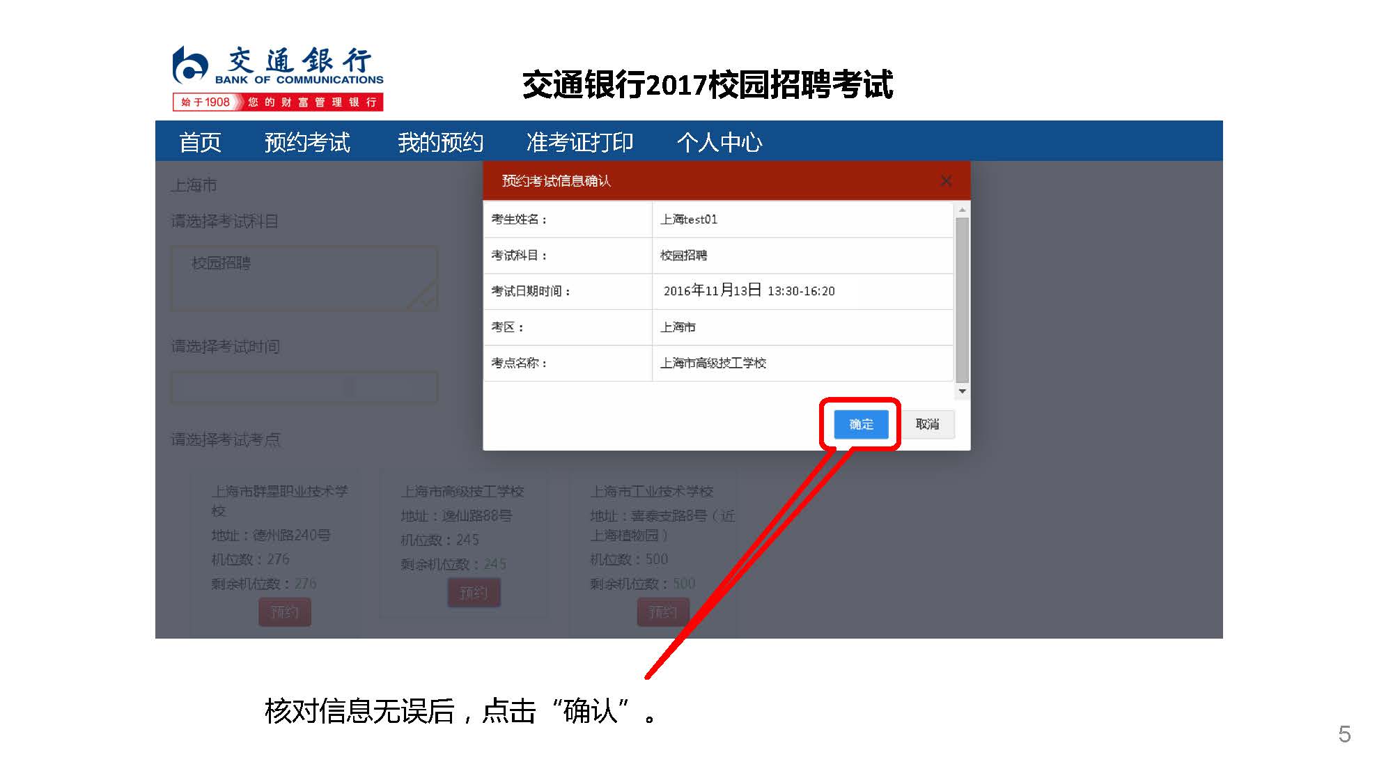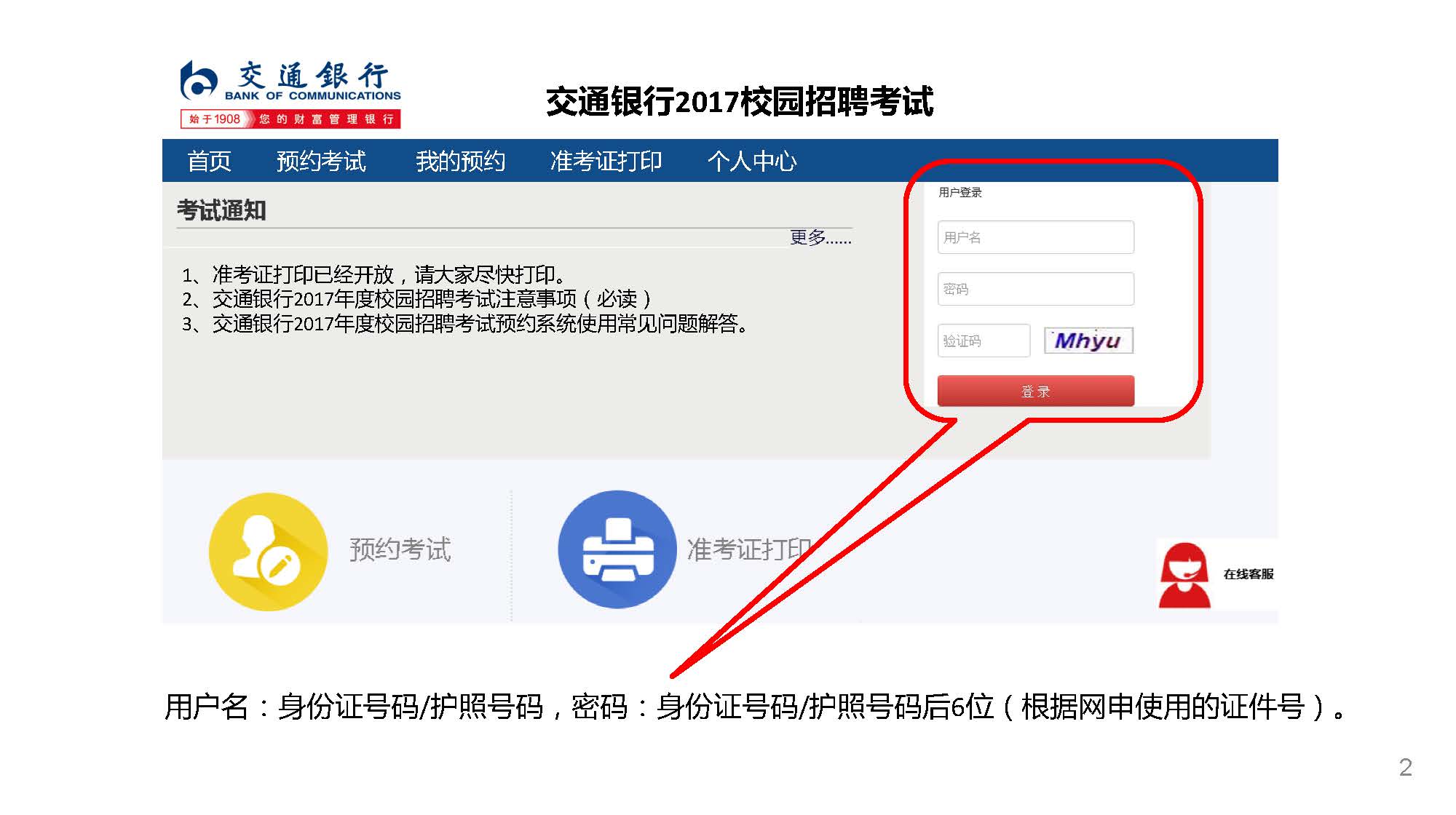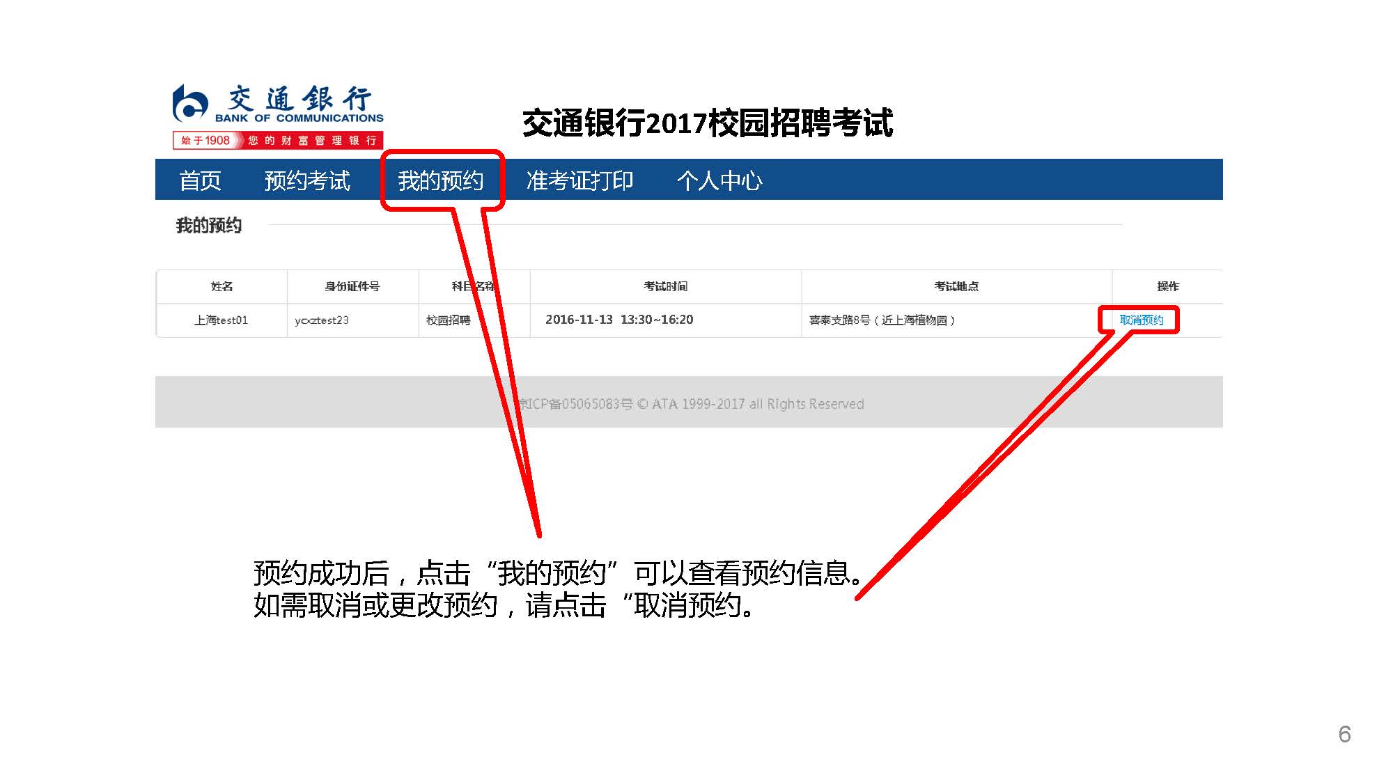 如逾期未預(yù)約,系統(tǒng)將根據(jù)考生申請(qǐng)的參考城市自動(dòng)分配考場(chǎng) 準(zhǔn)考證打印時(shí)間:2016年11月8日10:00-2016年11月12日24:00 考場(chǎng)預(yù)約及準(zhǔn)考證打印地址:bankcomm.campustest.cn 客服熱線:021-61948899