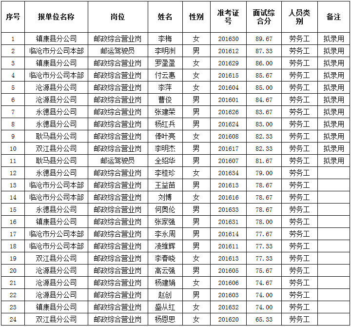 根據(jù)《關于統(tǒng)一規(guī)范全省郵政企業(yè)市場化用工招聘業(yè)務流程的通知》云郵分人資函〔2016〕84號文件的要求,按照“公平、公正、公開”的原則,臨滄市郵政分公司勞務工招聘考試已結(jié)束,經(jīng)紀檢監(jiān)察審定,現(xiàn)將擬錄用情況進行公示。