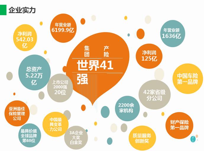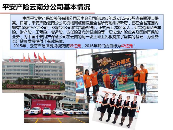 平安產(chǎn)險(xiǎn)是中國(guó)平安保險(xiǎn)集團(tuán)長(zhǎng)期以來(lái)經(jīng)營(yíng)和發(fā)展的基礎(chǔ),28年來(lái),平安產(chǎn)險(xiǎn)業(yè)務(wù)規(guī)模逐年攀升,業(yè)務(wù)發(fā)展穩(wěn)健。經(jīng)營(yíng)區(qū)域覆蓋全國(guó),在國(guó)內(nèi)各省市、自治區(qū)設(shè)有42家分公司,2100多個(gè)營(yíng)業(yè)網(wǎng)點(diǎn);此外,還在世界150個(gè)國(guó)家和地區(qū)的近400個(gè)城市設(shè)立了查勘代理網(wǎng)點(diǎn),與中國(guó)再保險(xiǎn)集團(tuán)公司、漢諾威再保公司、安聯(lián)再保公司、慕尼黑再保公司、瑞士再保公司等國(guó)內(nèi)外160多家保險(xiǎn)公司、再保公司建立了業(yè)務(wù)往來(lái)。2015年公司整體保費(fèi)收入突破1600億,已擁有中國(guó)第一大車(chē)險(xiǎn)品牌,是全國(guó)第二大財(cái)產(chǎn)保險(xiǎn)公司。