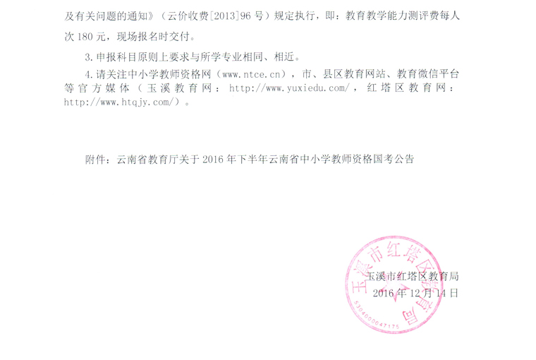 玉溪市紅塔區(qū)關(guān)于2016年下半年教師資格