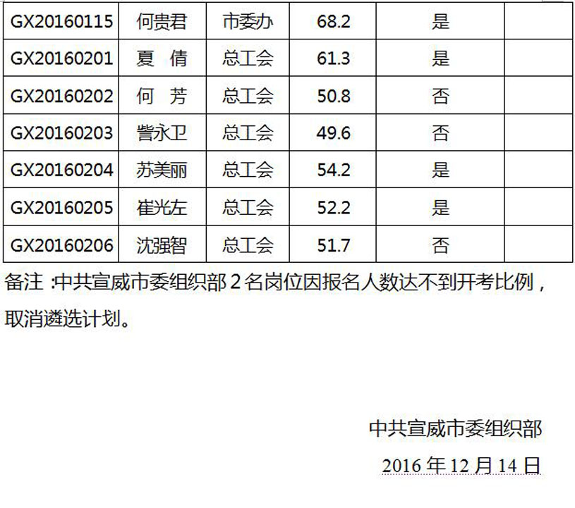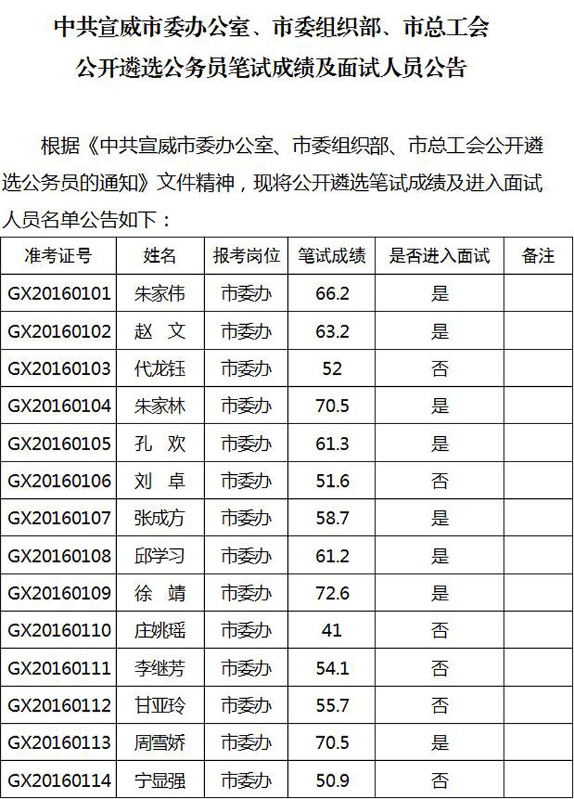 中共宣威市委辦公室、組織部、總工會(huì)2016年遴選公務(wù)員筆試成績(jī)公告