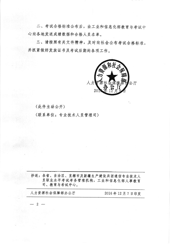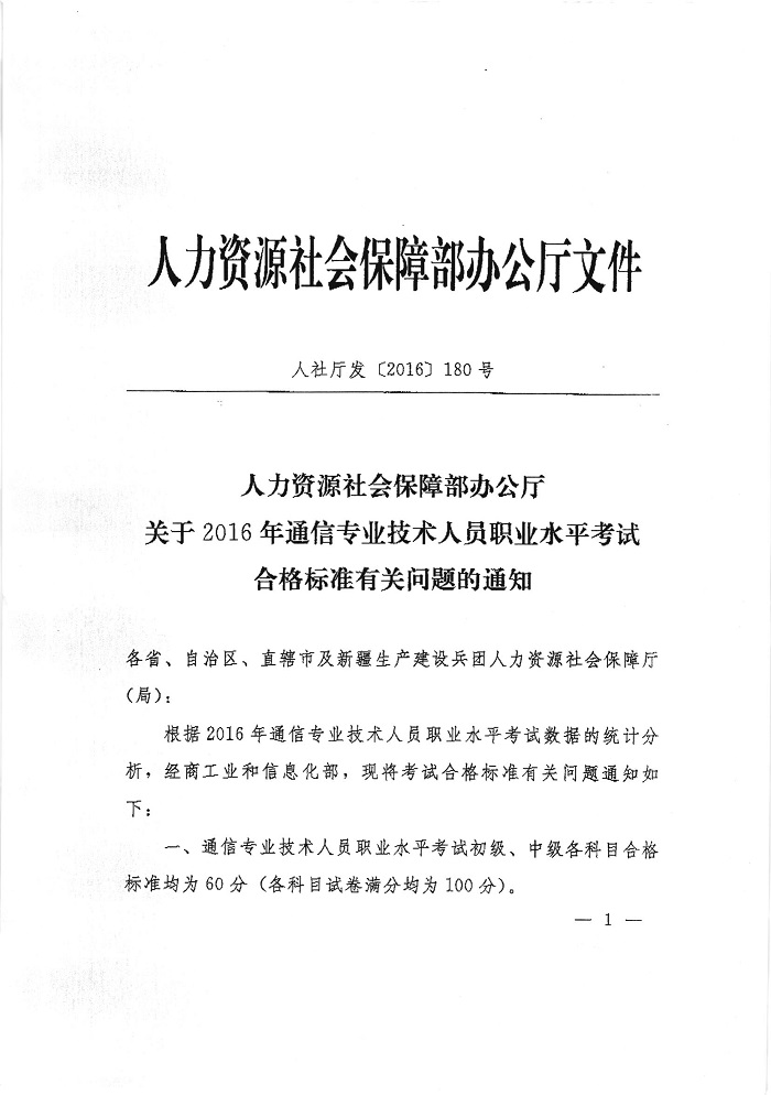 人社部關于2016年通信專業(yè)技術人員 職業(yè)水平考試合格標準有關問題的通知