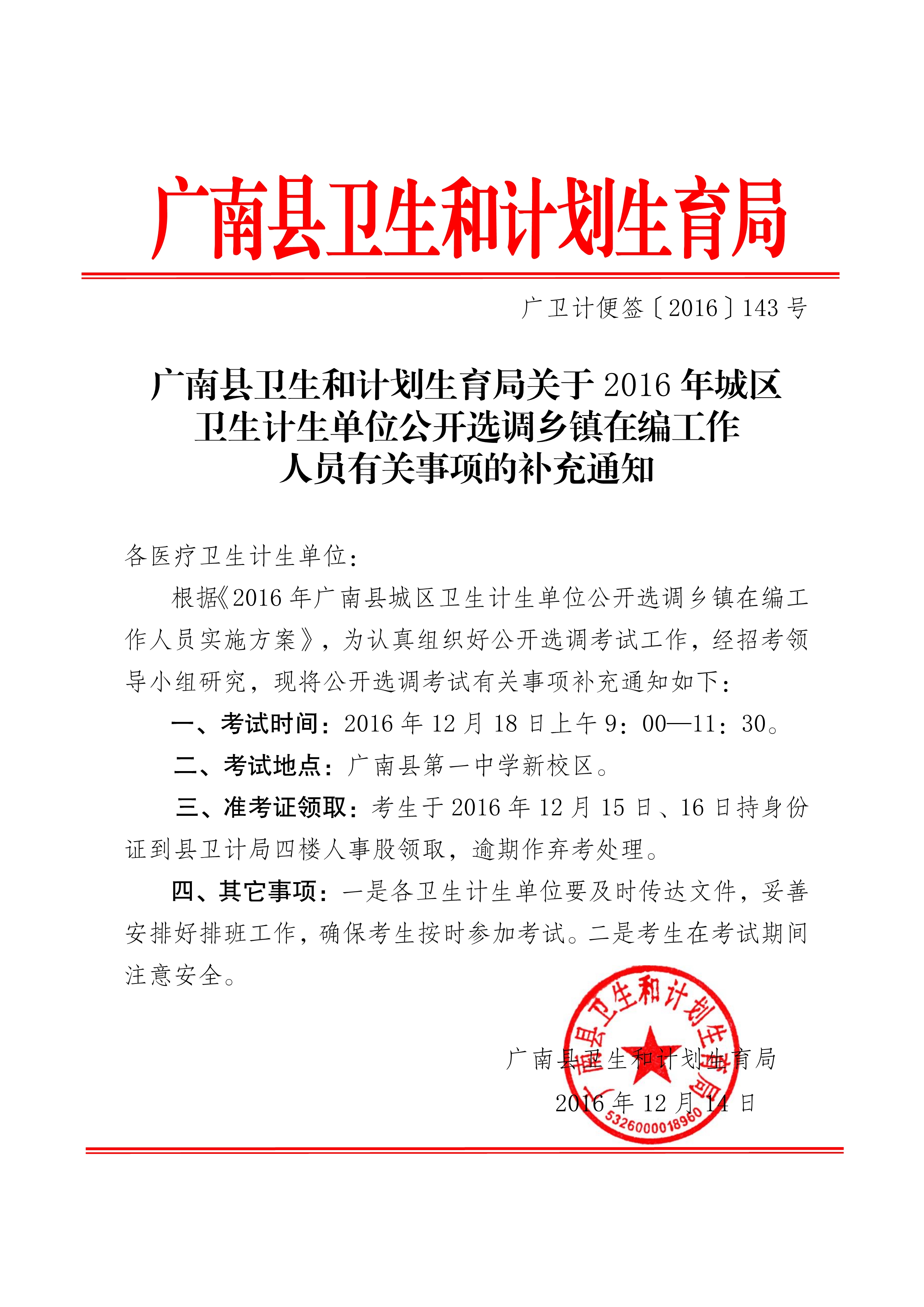 廣南縣關(guān)于2016年城區(qū)衛(wèi)生計生單位選調(diào)人員補充通知